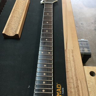 First step, off with his head. Then the levelling beam. There was a fair bit of work to get the frets level across the board. Followed by a roll off at the end.